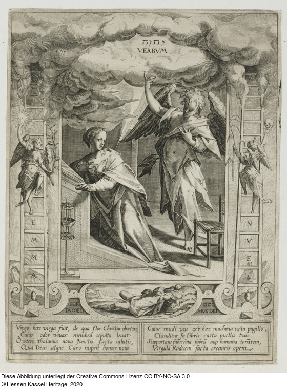| Hist. Inhaltsverzeichnis: | 6. | Eine weibl: Figur vor einem Tische knieend, hinter ihr ein Engel, der in die Wolken zeigt, / wo יהוה Verbum zu lesen; zu beyden Seiten in die Wolken reichende Leitern, / auf der einen steigt ein Engel herab; auf der andern, ein anderer hinauf; darunter: / Virgo haec virga –– creantis opem |