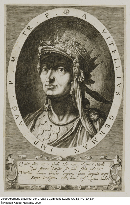 | Hist. Inhaltsverzeichnis: | 88. | Vitellius in rundem Format mit den Namens Inschriften; unter / jedem 4. lat: Verse. |