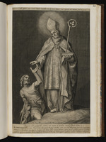 Unten horizontale Falte. Kopie (gegenseitig) des Stichs "Der Hl. Gregor von Utrecht" von Frederick Bloemaert nach Abraham Bloemaert, mit anderer Inschrift und geänderten Attributen (Kind mit Löffel statt Bettler, Meer im Hintergrund). Vermutlich Teil einer Serie mit den Kirchenvätern. Vgl. die vorangegangenen Blätter im Band: Inv.-Nr. GS 20302, fol. 121 (Ambrosius) und GS 20302, fol. 122 (Gregor, dort mit Verlegeradresse „Corn Dankerts Exc.“). |