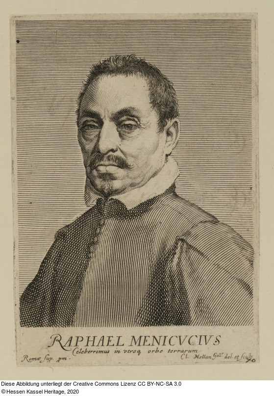 in der Platte: RAPHAEL MENICVCIVS; Celeberrimus in vtroq orbe terrarum; Romae sup. pm. Cl. Mellan Gall.' del. et sculp.;