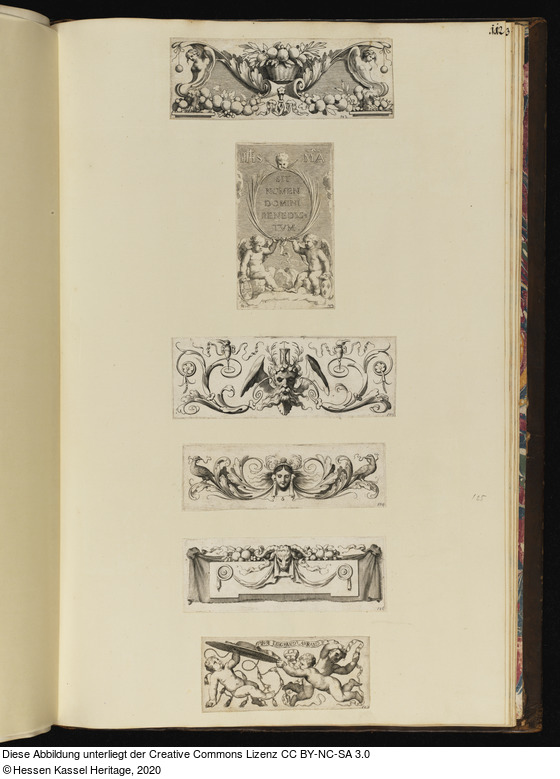 | Hist. Inhaltsverzeichnis: | 112. | Frise où est un corbeille de fruits au milieu ... Frise, trois petit enfans, qui portent un chapeau de Cardinal, ou est ecrit: Pour le grand Armand |