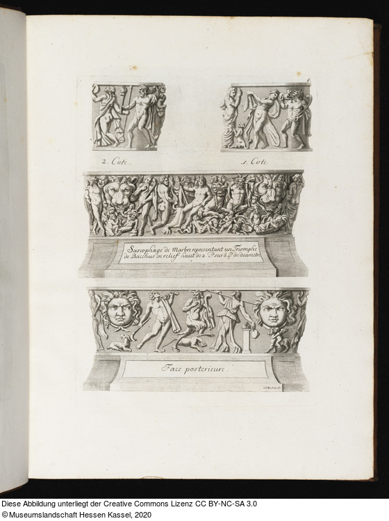 in der Platte: 4.; 2. Cote.; 1. Cote.; Sarcophage de Marbre representant un Triomphe de Bacchus en relief haut de 2. P. sur 6. P. de diametre.; Face posterieure.; C F Boetius Sc:;