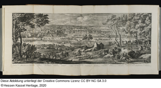 Gedruckt von zwei Platten, zusammengesetzt aus zwei Bogen. Drei weitere vertikale Falten. Am unteren Rand links zwei Einrisse, hinterlegt. Nach einem Werk von A. F. van der Meulen. Die Platten wurden 1670 fertiggestellt. Vgl. Richefort, Isabelle: L'oeuvre gravé de Van der Meulen, in: A la gloire du Roi. Van der Meulen, peintre des conquêtes de Louis XIV, Paris 1998, S. 322. |