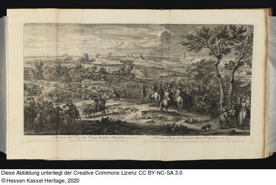 in der Platte: R. Bonnart, Sculpsit.; Arriuée du Roy au camp deuant Mastrick, en l'année 1673; Dessigné sur le Naturel, et peint pour le Roy tres-chrestien par F. Vander Meulen. Se distribue à Paris par l'Auteur, en l'Hostel des Manufactures Royales, des Gobelins, Et en;