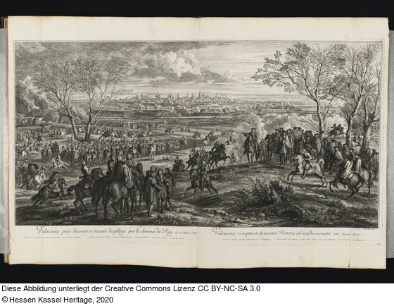 in der Platte: R. Bonnart, sculp.; Valencienes prise d'assaut, et sauuée du pillage par la clemence du Roy le 16. Mars 1677; Dessigné sur les lieux pour le Roy tres-chrestien par F. Vander Meulen. Se distribue à Paris par l'Auteur, en l'Hostel des Manufactures Royales,;