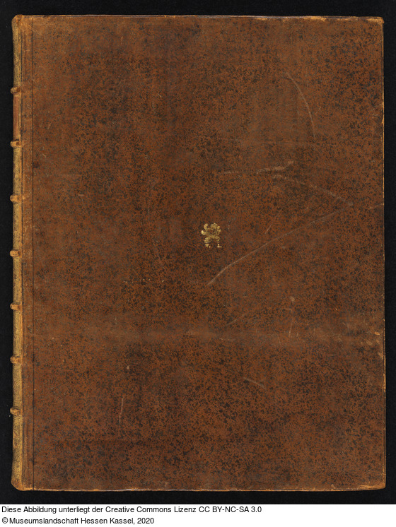 Der Band ist in gesprenkeltes Leder gebunden. Der goldgeprägte Rücken mit sieben Bünden trägt ein rotes Titelschild. Die Buchdeckel sind mit einem goldgeprägten doppelschwänzigen Löwen mit Krone und den Initialen W. L. versehen. Hallo weist den Stempel Wilhelm VIII. zu. Vgl. Rudolf Hallo: Das Kupferstichkabinett und die Bücherei der Staatlichen Kunstsammlungen zu Kassel. 2. veränderte Aufl., Kassel 1933, S. 18, Nr. 190; 159.