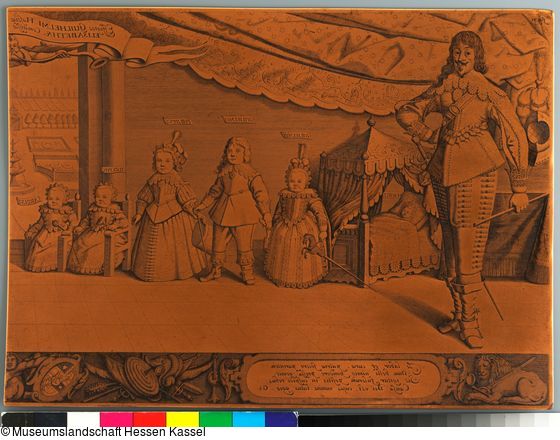 Druckplatte: Gruppenporträt Landgraf Wilhelm V. von Hessen - Kassel mit 6 Söhnen, abgedruckt in: Monumentum Sepulcrale, 1638, fig. 32