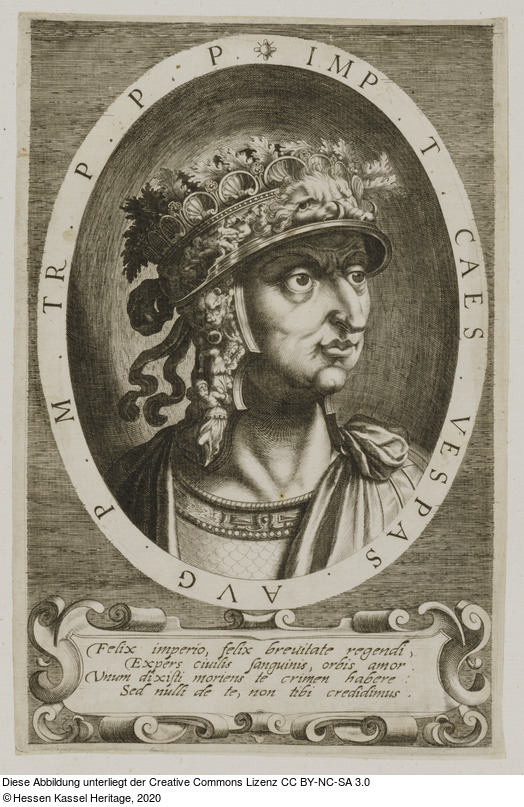 | Hist. Inhaltsverzeichnis: | 89. | Titus Vespasianus. in rundem Format mit den Namens Inschriften; unter / jedem 4. lat: Verse. |