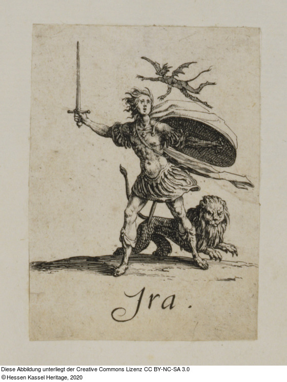 Sekundäre Ikonographie: 11N33 Zorn (Ripa: Ira): Personifikation einer der sieben Todsünden Sekundäre Ikonographie: 45B der Soldat; Soldatenleben Primäre Ikonographie: 25F23(LION) Raubtiere: Löwe Primäre Ikonographie: 45C13(SWORD) Hieb- und Stichwaffen: Schwert Primäre Ikonographie: 45C19(SHIELD) Defensivwaffen, Schutz vor Waffen: Schild Sekundäre Ikonographie: 11K Teufel und Dämonen |