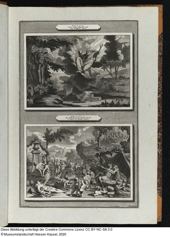 in der Platte: GEN. V. Vs. 24. Godt neemt Henoch wech. Dieu Transporte Henoch.; GEN. VI. Vs. 1 .... 5. De Godloosheyt der Eerste Wereld. L'Impieté du Premier Monde.; 5; J. Goeree del.; Avec Privilege; J. Baptist scul;