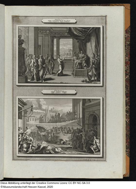 Beschriftungen: in der Platte: GEN. XLI. Vs. 25. Joseph Verkondight Pharao syn Droom. Joseph Interpréte les Songes de Pharaon.; Le Potre In.; GEN. XLI. Vs. 55 ... 57. Joseph Begeert Egypten. Joseph Gouverne l'Egypte.; 25; P. Mortier edit: Avec Privilege;