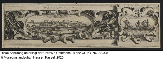 Primäre Ikonographie: 45K21 Belagerung Primäre Ikonographie: 25I1 Stadtansicht (allgemein); Vedute Primäre Ikonographie: 45H Schlacht, bewaffnete Auseinandersetzungen (generell) Primäre Ikonographie: 46C24 Segelschiff, Segelboot Primäre Ikonographie: 48A9876 Kartusche (Ornament) Primäre Ikonographie: 45C1 Waffen |