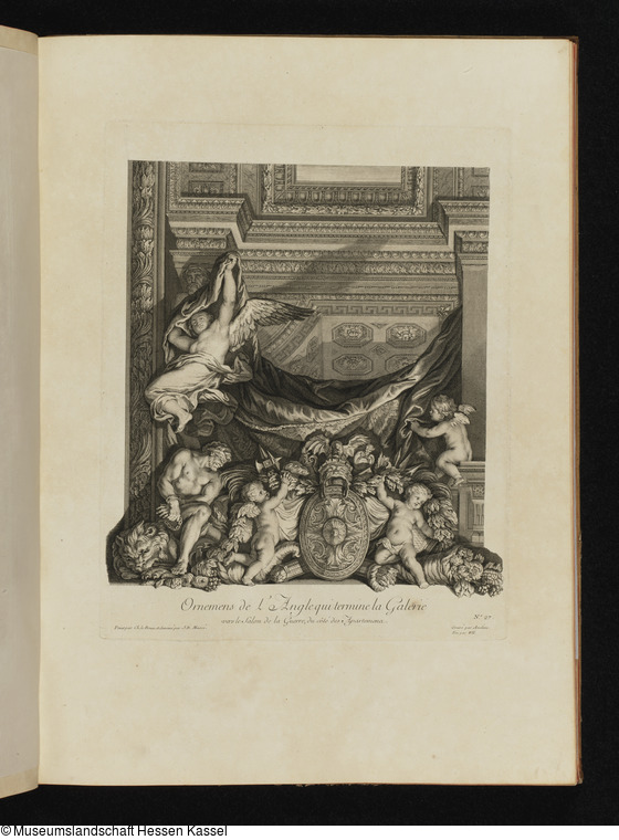 in der Platte: Ornemens de l'Angle qui termine la Galerie vers le Salon de la Guerre, du côté des Apartemens.; Peint par Ch. Le Brun. et dessiné par J. B. Massé.; N.o 27.; Gravé par Aveline. Fini par Will.;