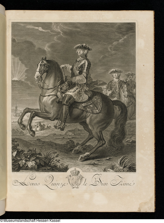 in der Platte: Peint par C. Parrocel, la Teste par J. Chevallier d'aprés le Buste sant par J. B. le Moine; Gravé par J. G. Will; Ecrit par Le Parmentier Graveur ordinaire du Roy pour ces Finances.; Louis Quinze Le Bien Aimé;